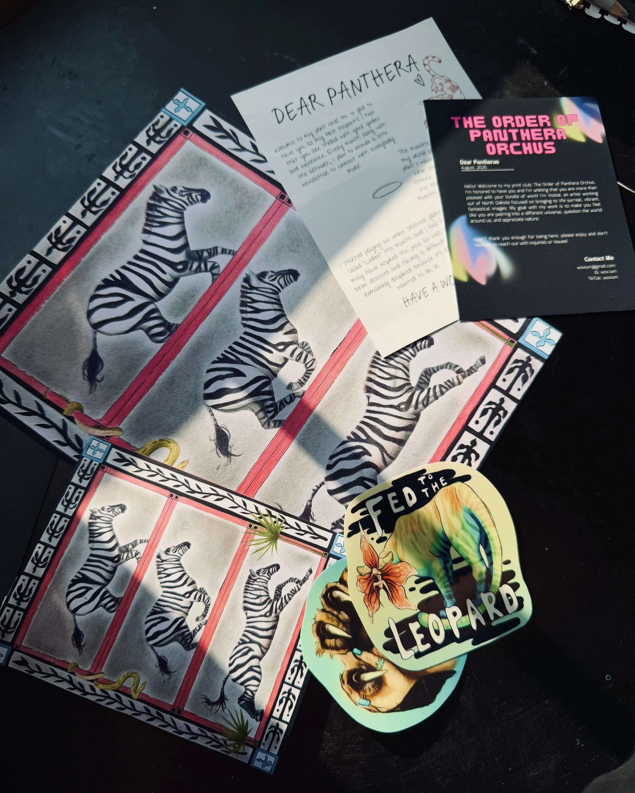 The Order of Orchus Panthera is now ready! Every month you will receive one 8 by 10 inch print, two stickers, a greeting card, and newsletter all exclusive to the order!